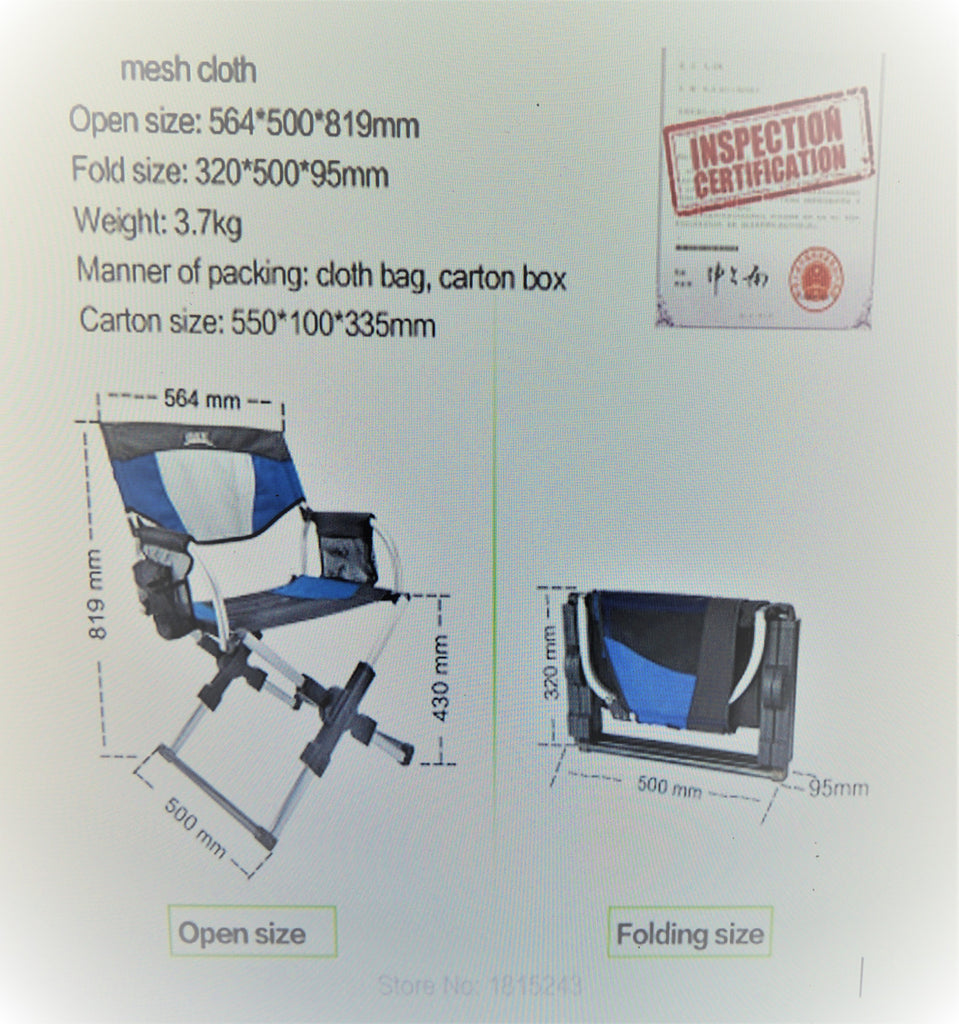 This chair is made with a high strength aluminium alloy (6061) frame, the cloth material is made of 600x500D high strength PVC Oxford cloth.